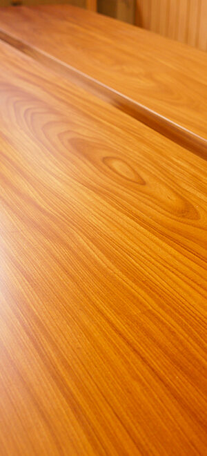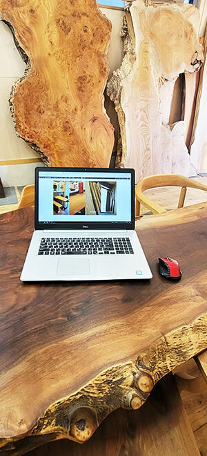 榎本銘木には木目がよく見えるように美しく磨いた天然木一枚板を数百枚展示在庫しています。