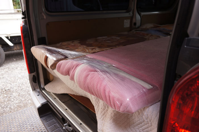 商品を丁寧に毛布で包んで配送。。。それより、これで扉締まるのか?? 脚も積んでみると、こんな