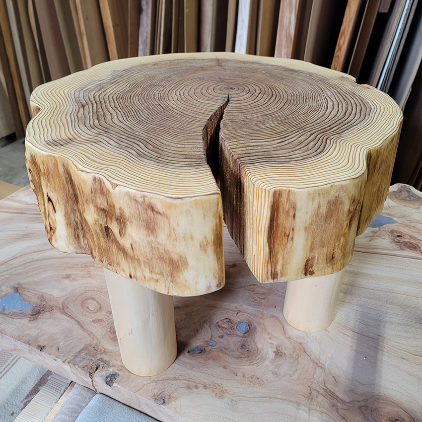 先ずは前回、最後に少しだけご紹介した輪切りの丸太、全体を磨いて脚の取り付けを行って完成しました。