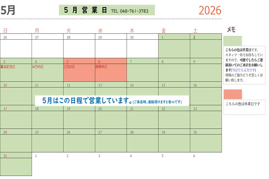 5月はゴールデンウィーク中に二日間お休みをいただきます。それ以外は通常営業していますので是非ご来店ください。